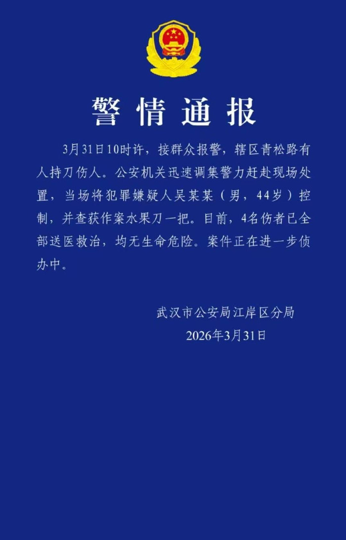 3月31日,武汉市警方发布警情通报,44岁的男子吴某某因持刀伤人被警方控制,4名伤者均无生命危险。